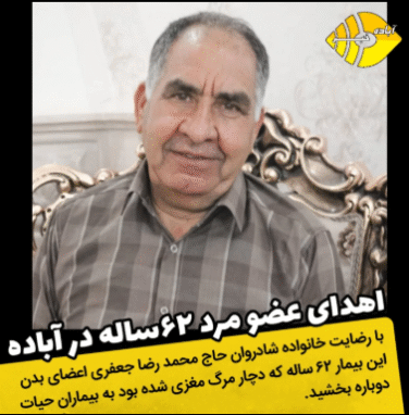 🔺به گزارش آباده خبر، با رضایت خانواده شادروان حاج محمد رضا جعفری اعضای بدن این بیمار ۶۲ ساله که دچار مرگ مغزی شده بود به بیماران حیات دوباره بخشید .